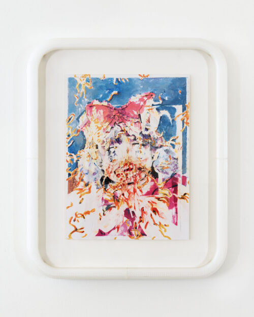 Say “fuzzy pickles!”, 2025. 17 1/4” x 14 1/2” x 1 3/4” framed, acrylic on mylar in 3D-printed frame.